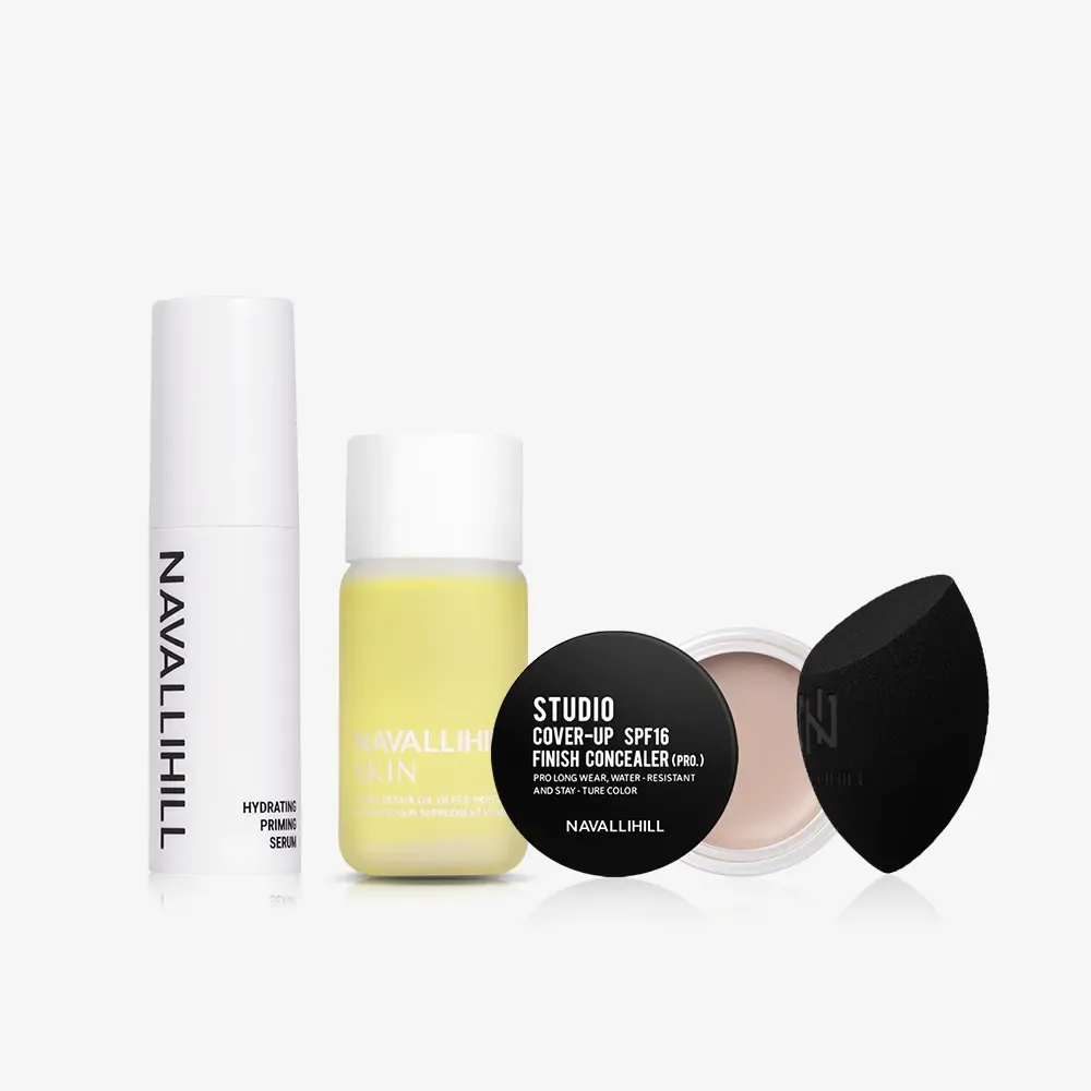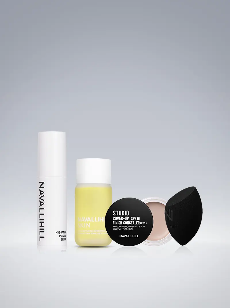 妝前以【粉貼妝爆水霜】補水打底,搭配 NAVALLIHILL 娜法莉兩款美容油(依膚質挑選),不僅能保濕滋潤、提亮肌膚、平紋抗皺,幫助調整肌膚的油水平衡。